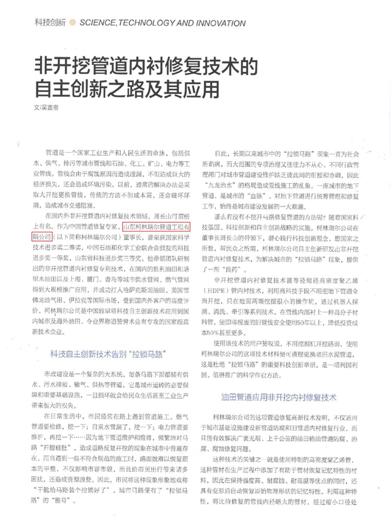 山東柯林瑞爾管道工程有限公司是國家級高新技術企業,水資源節約與保護產業創新聯盟理事單位。公司與中國石油大學(華東)、北京化工大學等多家知名院校和國家實驗室建立了長期密切的合作關系。公司被評為“山東省專利明星企業”,“質量信得過單位”,“企業信用AAA級單位”,山東省“專精特新”企業。